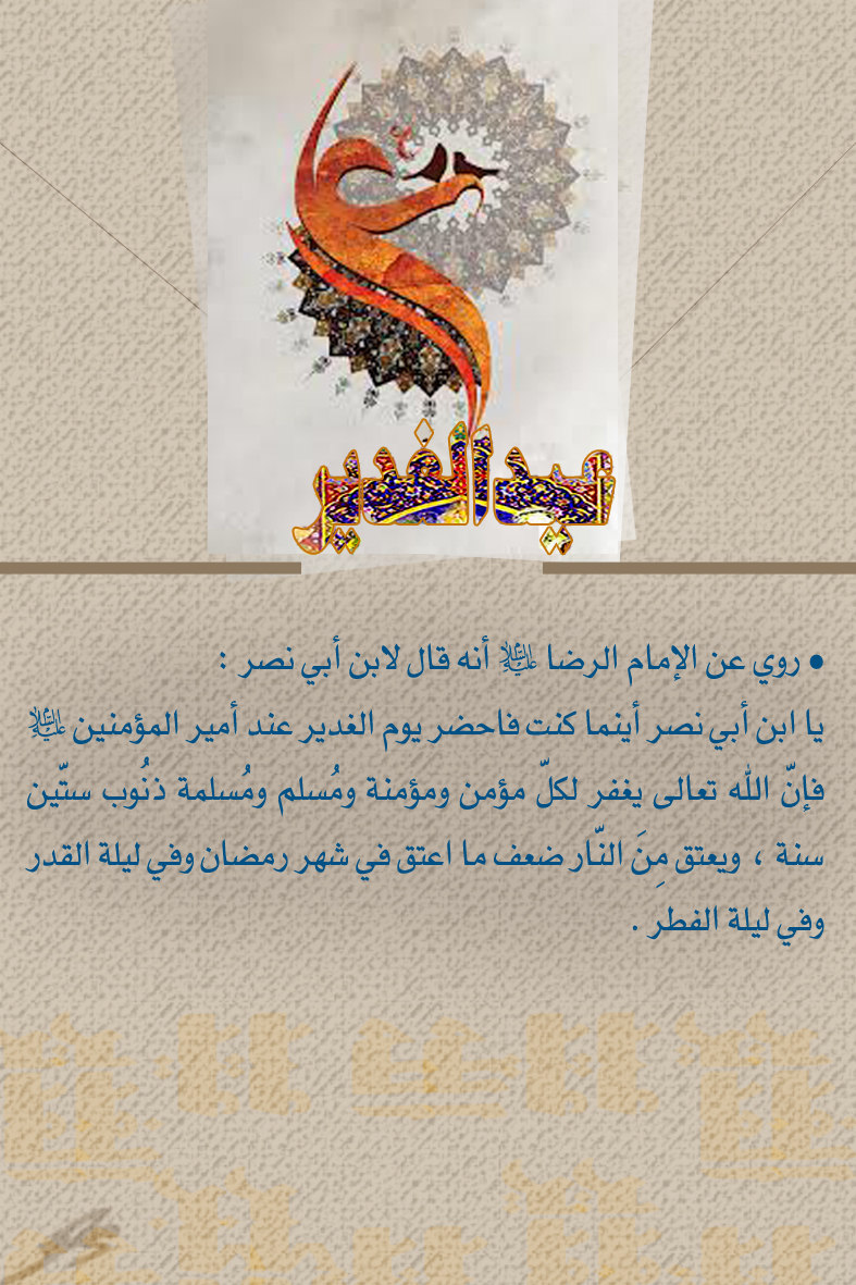 وحثت الكلمات على الإقتداء بسيرة الإمام علي عليه السلام ومواقفه الجهادية. بسم الله الرحمن الرحيم اللهم صل على محمد وآل محمد وعجل فرجهم عيد الغدير عيد الله الاكبر وعيد آل محم د عليهم السلام وهو أعظم الاعياد فما بعث الله تعالى نبي ا ال ا وهو يعيد هذا اليوم ويحفظ ح رمته واسم هذا اليوم.