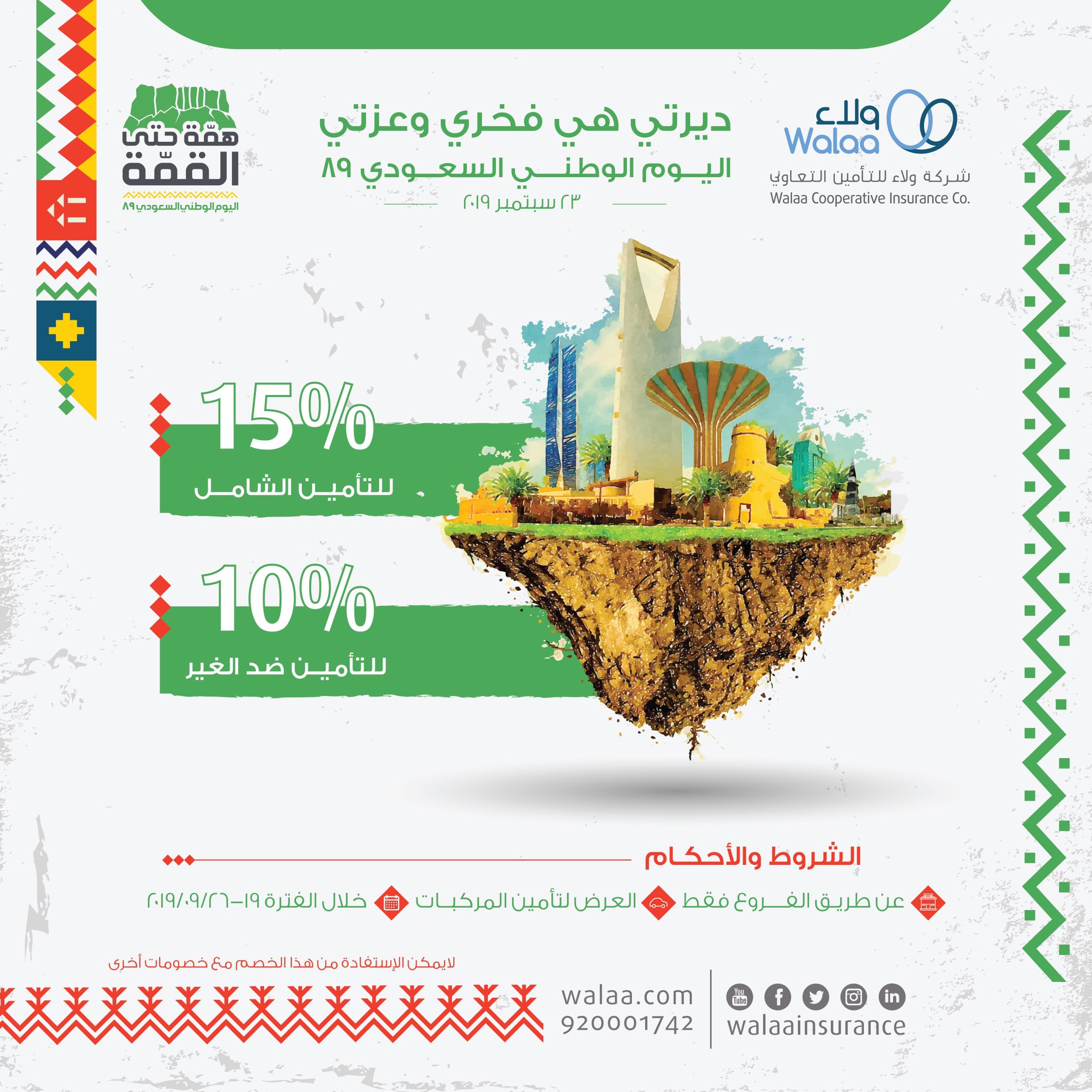 ولاء للتأمين On Twitter ديرتي هي فخري وعزتي احتفالا باليوم الوطني ال٨٩ ولاء للتأمين تقدم لكم خصم على تأمين المركبات عن طريق الفروع اليوم الوطني ٨٩ همة حتى القمه Https T Co Zijb9ghx6o